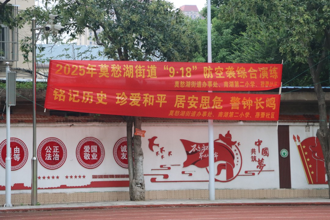 9 月 18 日,在这个镌刻民族记忆的特殊日子,南京市南湖第二小学与莫愁湖街道、蓓蕾社区联合开展主题为“铭记历史、筑牢防线” ——“9・18” 防空袭疏散演练及人防知识宣讲活动。全校师生在沉浸式体验中夯实安全意识,于回望历史中厚植爱国情怀。上午 10 时整,尖锐的防空警报划破校园上空,防空袭疏散掩蔽演练正式启动。听到警报后,各班师生反应迅速:教师引导学生以课