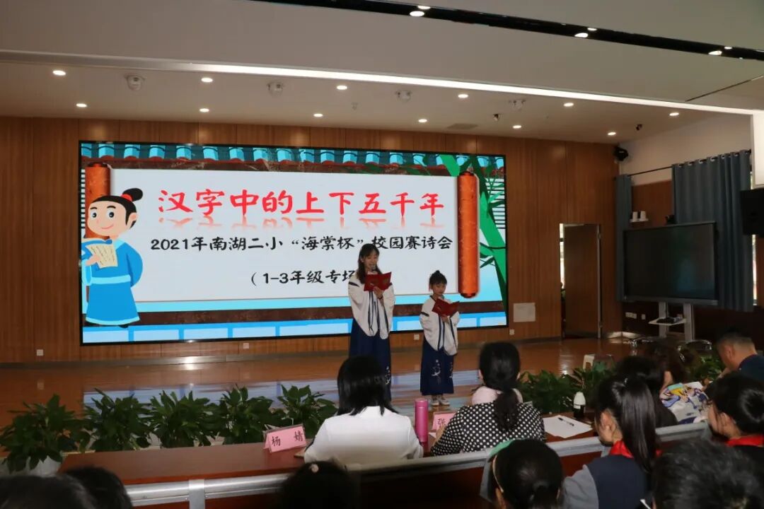 汉字是中国的文化,诗歌是中国文化的经典,这些文化流淌在中国人的血液之中,成为了民族精神不可分割的一部分,南湖二小的孩子们从小学汉字,读古诗,传承文化经典,润泽童年岁月。五月的校园,海棠花开,一年一度的“赛诗会”拉开帷幕,学校成了诗歌的海洋。二1中队的孩子们在礼堂里面为大家讲述了梅兰竹菊的故事,追寻汉字背后的起源,讲述诗歌中的君子故事,孩子们抑扬顿挫的朗读回荡