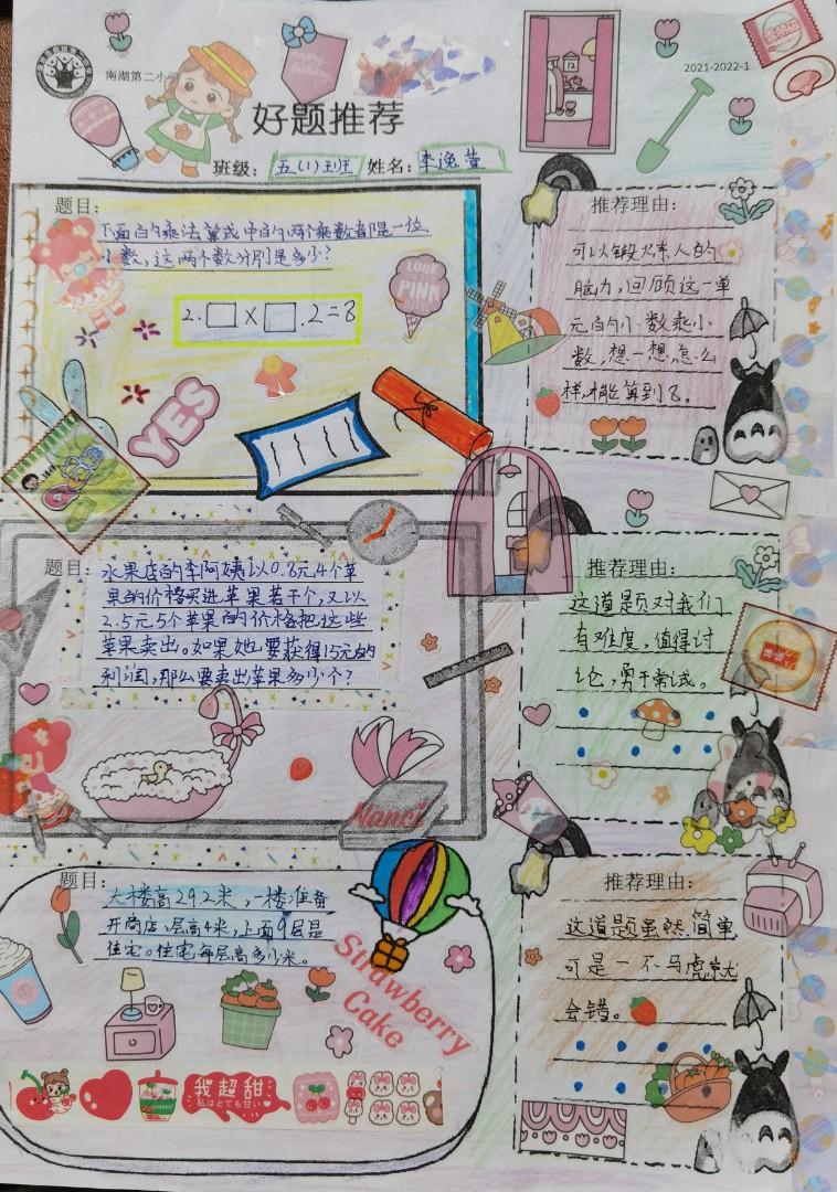 在国家“双减”政策的背景下,为了让南湖二小的小朋友们拥有更多的时间和空间,发现数学学习的魅力,提升学习数学的兴趣,南湖二小数学组开展了数学特色作业的活动。五年级的小朋友们根据本册书所学知识,制作了一份“好题推荐”设计单,向同学们推荐自己喜欢的题目,并写出推荐理由。学校根据班级整理的推荐单,每班评选了5名获奖同学,并颁发了奖状和奖品。