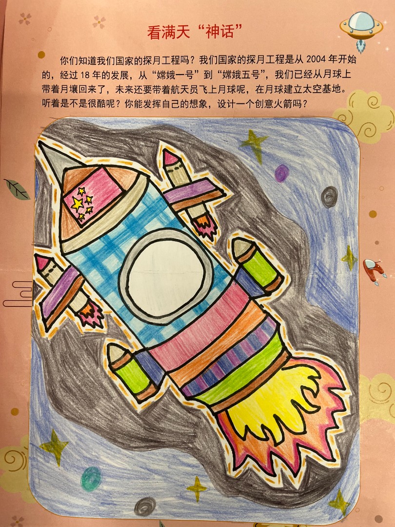 我们国家从2004年开始,经过18年的发展,从“嫦娥一号”到“嫦娥五号”,未来我们还要带航天员飞上月球。这个中秋节班级举行了设计创意火箭的活动,孩子们纷纷用五彩画笔,勾勒出梦中的火箭,极大地激发了学生探索宇宙的热情。