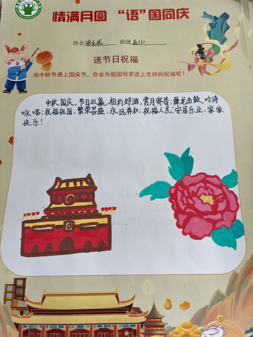 今年的中秋节正好遇上了国庆,五1中队的孩子们怀着激动的心情,为祖国母亲送上了深深的祝福。他们用画笔,用文字表达着对祖国母亲最深的眷恋。瞧,这是他们的作品!