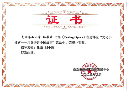 为了培养学生的家国情怀和中国文化自信,传播中华传统文化,让每个同学都能向世界讲述中国好故事,建邺区教师发展中心举办了“文化小播客” ———用英语讲中国故事的活动,通过英语童谣、演讲和戏剧等形式,旨在提高学生的英语核心素养。在校内海选环节,我校三至六年级全体同学积极参加,踊跃提交作品。经过英语教研组研究讨论,最终上报了两份优秀作品。这两份作品在区级评审中,均获